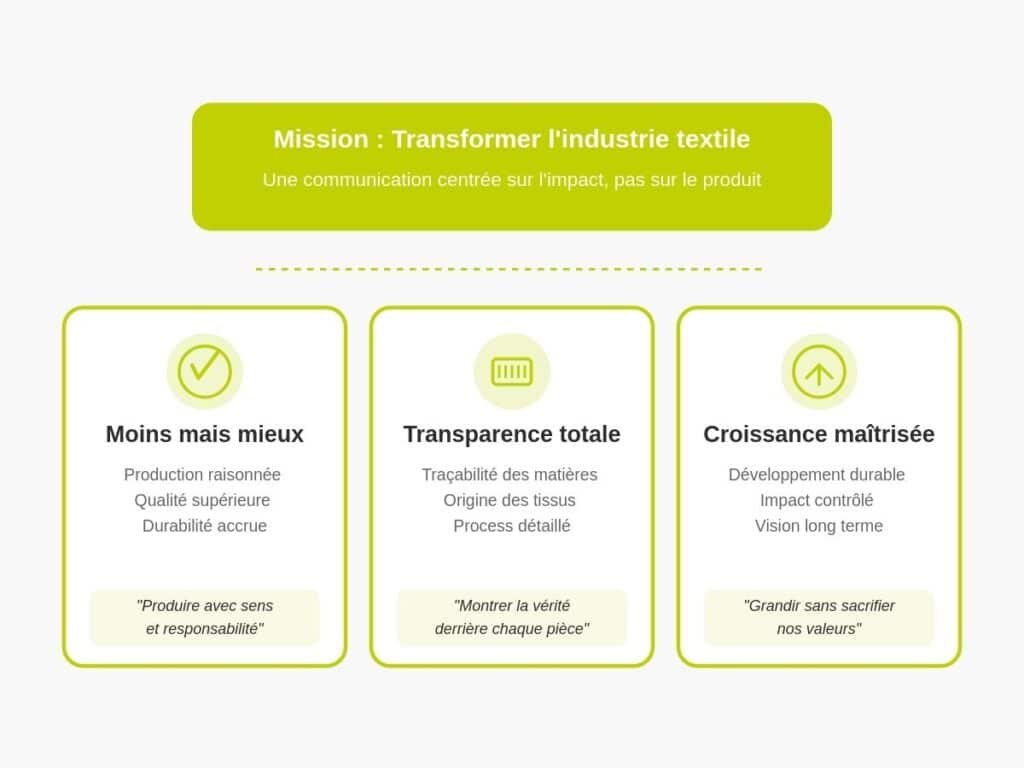 Je terminerai en citant l’exemple de la marque de vêtements Loom dont la communication est centrée sur une mission plutôt que sur le produit : celle de transformer l’industrie. C’est le parfait exemple d’un storytelling de mission qui vise à changer les comportements en prônant :