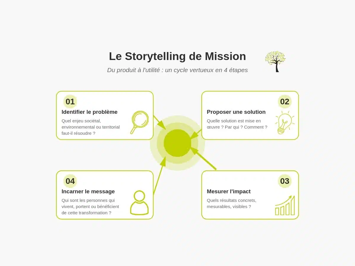 Nous assistons à un basculement majeur : on est passé du storytelling de produit au storytelling d’utilité. Le récit à impact se construit autour d’un cycle vertueux de 4 étapes :
