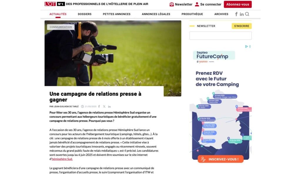L’Officiel des Terrains de Camping, média de référence des professionnels de l’hôtellerie de plein air, a consacré un article signé Jean-Guilhem de Tarlé au jeu-concours lancé par hémisphère Sud à l’occasion de ses 30 ans. Une parution particulièrement ciblée, qui témoigne de la capacité de l’agence à rayonner auprès des acteurs spécialisés de l’hébergement touristique.