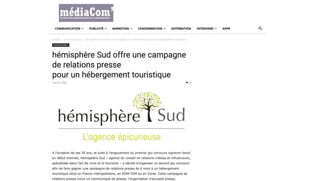 MédiaCom’, la lettre des professionnels de la communication, a relayé en avril 2025 le lancement d’un second jeu-concours organisé par hémisphère Sud à l’occasion de ses 30 ans d’existence. Fort du succès rencontré par le premier jeu-concours dédié aux vignerons en début d’année, l’agence a souhaité renouveler l’expérience en direction du secteur de l’hébergement touristique.